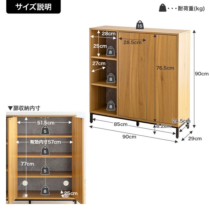 【耐荷重】天板:約15kg 、オープン収納棚板:約8kg、扉収納底板:約8kg、可動棚:約5kg