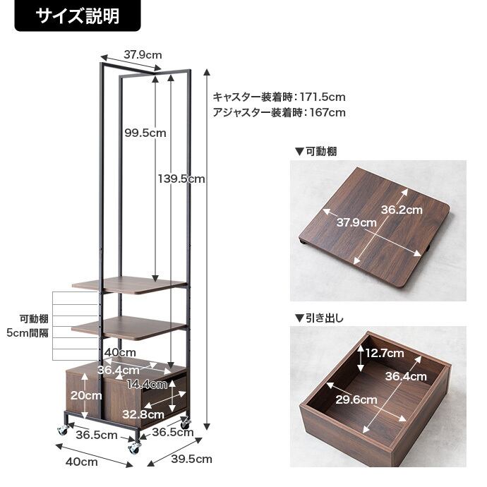 幅40cm×奥行39.5cm×高さ(キャスター装着時):171.5cm (アジャスター装着時):167cm