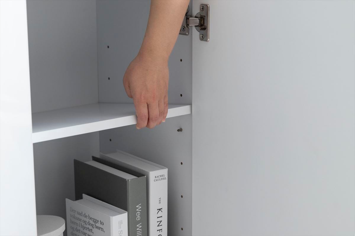 【ホワイト】本体:パーティクルボード、天板:メラミンシート貼り、扉:鏡面貼り、側面:紙貼り